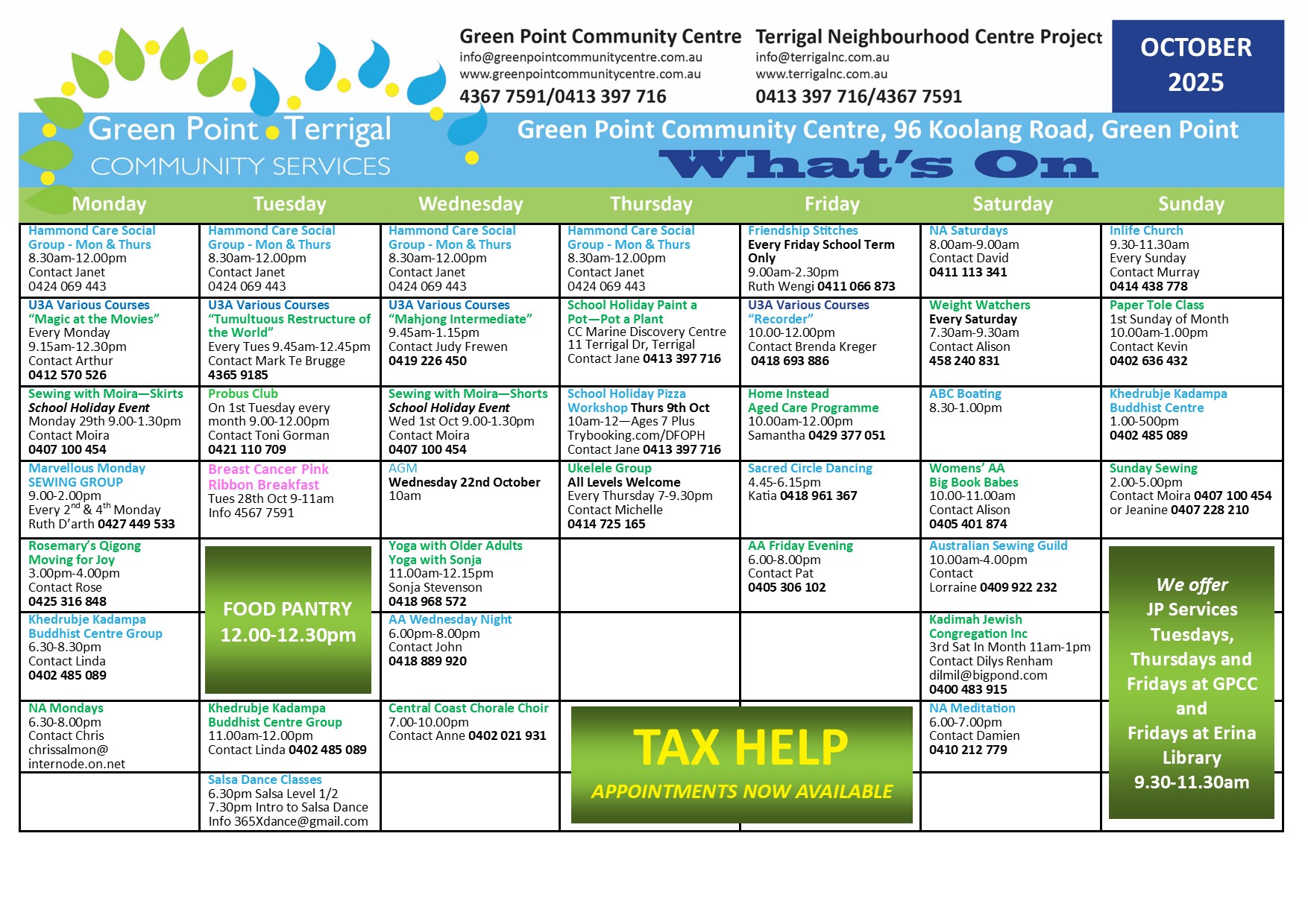 Green Point-Terrigal Community Services Inc. is dedicated to making a positive impact in Green Point, Erina, East Gosford, Wamberal, and Terrigal. We offer a range of programs and support services designed to strengthen our community, connect people, and provide assistance where it’s needed most.